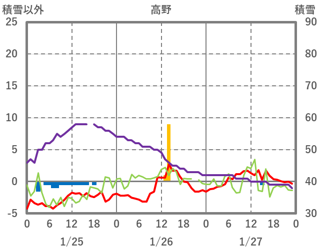 | 日 | 時 | 気温 | 降水 | 風向/風速 | 日照 | 積雪 | 降雪 |