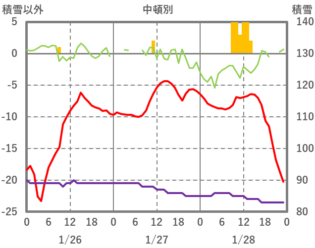 | 日 | 時 | 気温 | 降水 | 風向/風速 | 日照 | 積雪 | 降雪 |