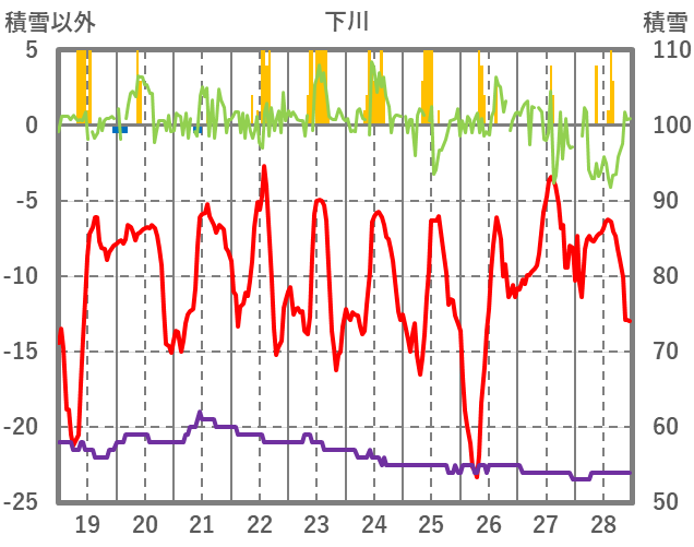 | 日 | 時 | 気温 | 降水 | 風向/風速 | 日照 | 積雪 | 降雪 |