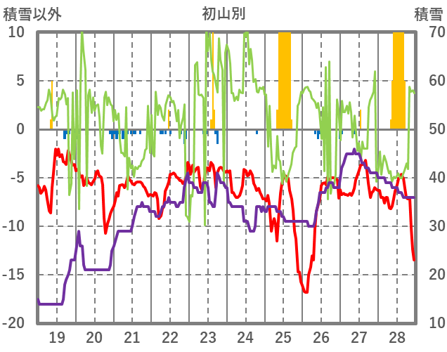 | 日 | 時 | 気温 | 降水 | 風向/風速 | 日照 | 積雪 | 降雪 |