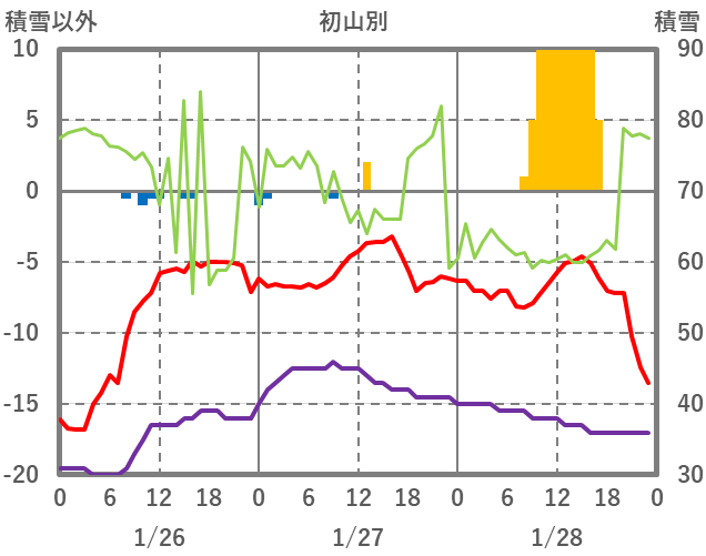 | 日 | 時 | 気温 | 降水 | 風向/風速 | 日照 | 積雪 | 降雪 |