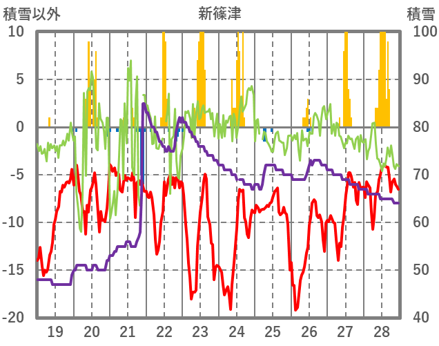 | 日 | 時 | 気温 | 降水 | 風向/風速 | 日照 | 積雪 | 降雪 |