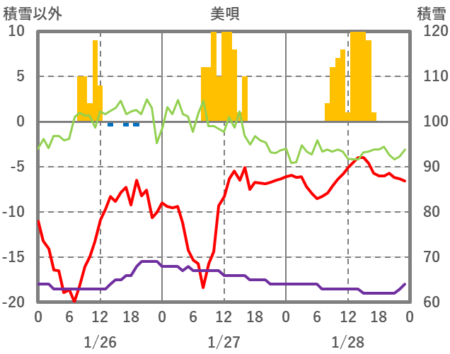 | 日 | 時 | 気温 | 降水 | 風向/風速 | 日照 | 積雪 | 降雪 |
