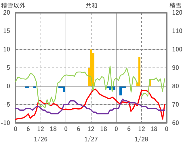 | 日 | 時 | 気温 | 降水 | 風向/風速 | 日照 | 積雪 | 降雪 |