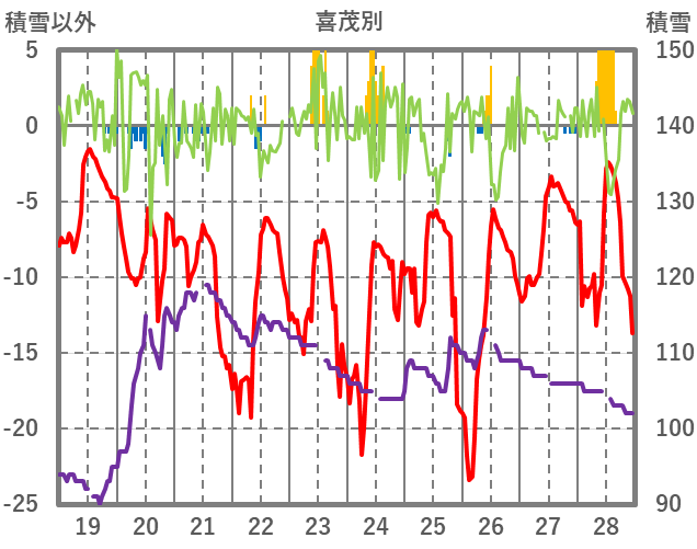 | 日 | 時 | 気温 | 降水 | 風向/風速 | 日照 | 積雪 | 降雪 |