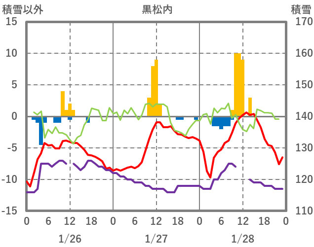 | 日 | 時 | 気温 | 降水 | 風向/風速 | 日照 | 積雪 | 降雪 |