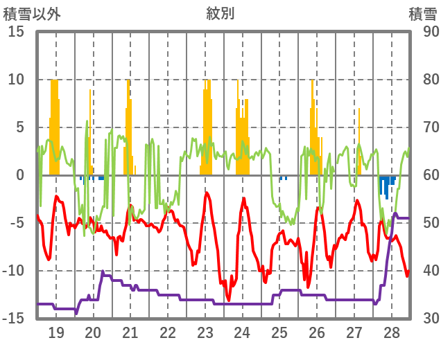 | 日 | 時 | 気温 | 降水 | 風向/風速 | 日照 | 積雪 | 降雪 |