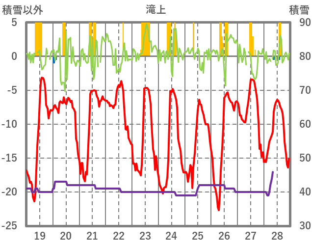 | 日 | 時 | 気温 | 降水 | 風向/風速 | 日照 | 積雪 | 降雪 |