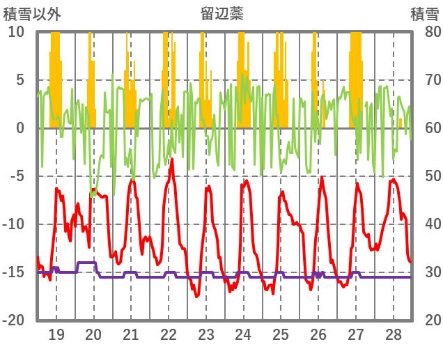 | 日 | 時 | 気温 | 降水 | 風向/風速 | 日照 | 積雪 | 降雪 |
