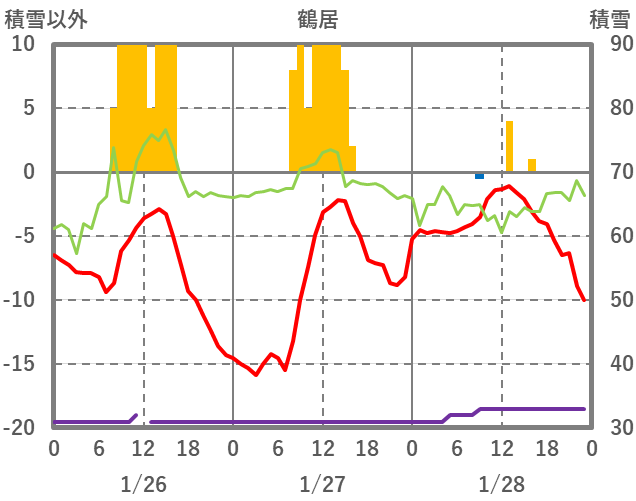 | 日 | 時 | 気温 | 降水 | 風向/風速 | 日照 | 積雪 | 降雪 |