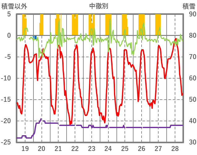 | 日 | 時 | 気温 | 降水 | 風向/風速 | 日照 | 積雪 | 降雪 |