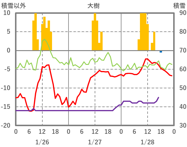 | 日 | 時 | 気温 | 降水 | 風向/風速 | 日照 | 積雪 | 降雪 |