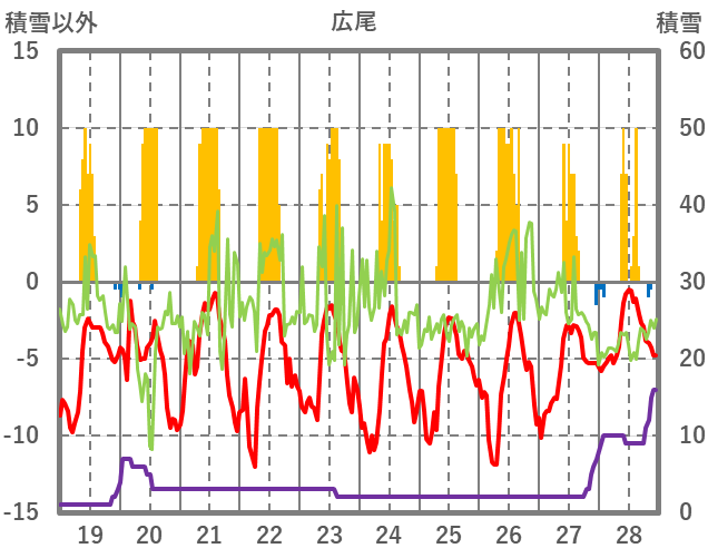 | 日 | 時 | 気温 | 降水 | 風向/風速 | 日照 | 積雪 | 降雪 |
