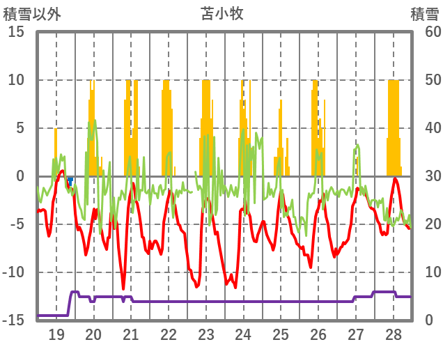 | 日 | 時 | 気温 | 降水 | 風向/風速 | 日照 | 積雪 | 降雪 |