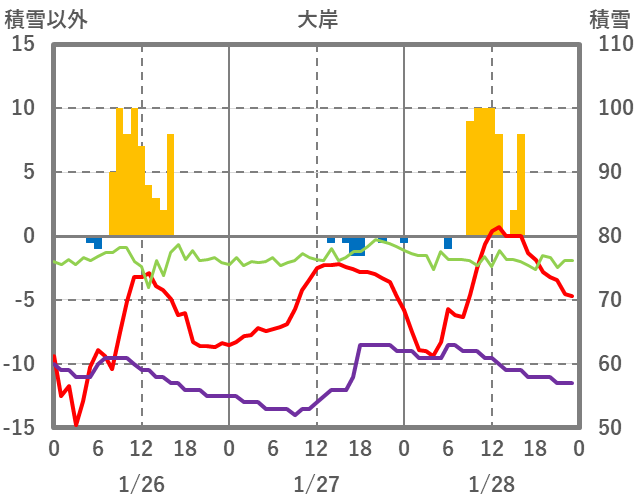 | 日 | 時 | 気温 | 降水 | 風向/風速 | 日照 | 積雪 | 降雪 |