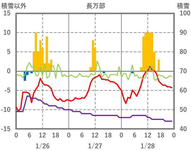 | 日 | 時 | 気温 | 降水 | 風向/風速 | 日照 | 積雪 | 降雪 |