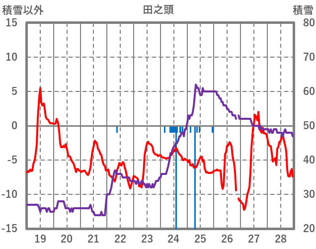 | 日 | 時 | 気温 | 降水 | 風向/風速 | 日照 | 積雪 | 降雪 |