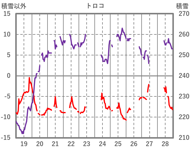 | 日 | 時 | 気温 | 降水 | 風向/風速 | 日照 | 積雪 | 降雪 |