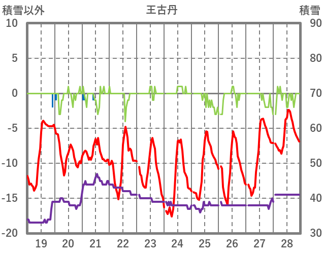 | 日 | 時 | 気温 | 降水 | 風向/風速 | 日照 | 積雪 | 降雪 |