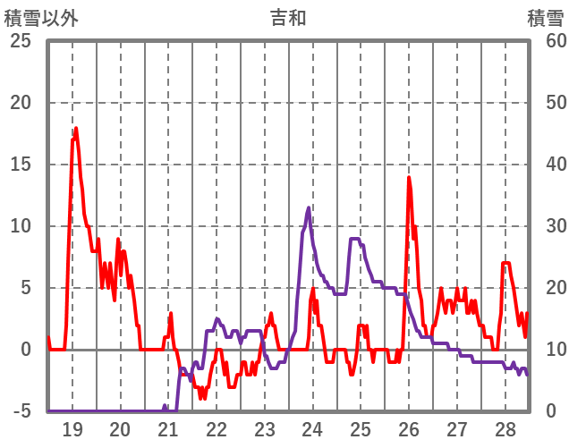 | 日 | 時 | 気温 | 降水 | 風向/風速 | 日照 | 積雪 | 降雪 |