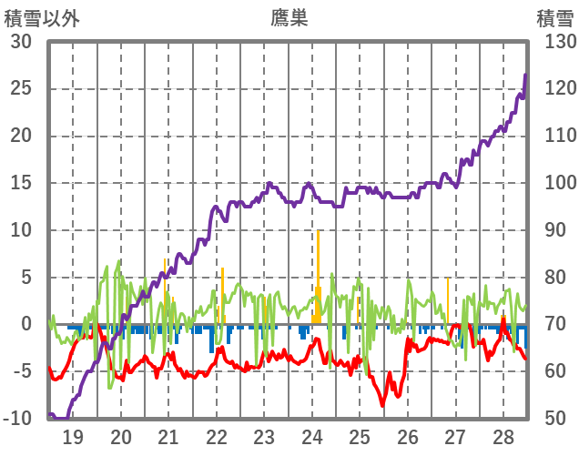 | 日 | 時 | 気温 | 降水 | 風向/風速 | 日照 | 積雪 | 降雪 |