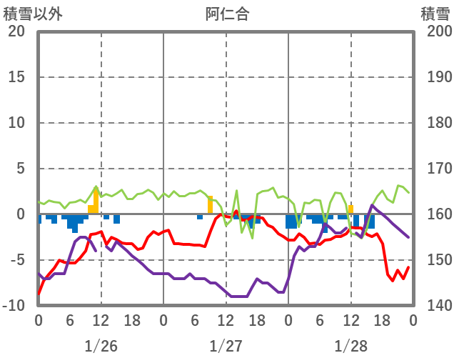 | 日 | 時 | 気温 | 降水 | 風向/風速 | 日照 | 積雪 | 降雪 |