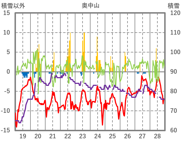 | 日 | 時 | 気温 | 降水 | 風向/風速 | 日照 | 積雪 | 降雪 |