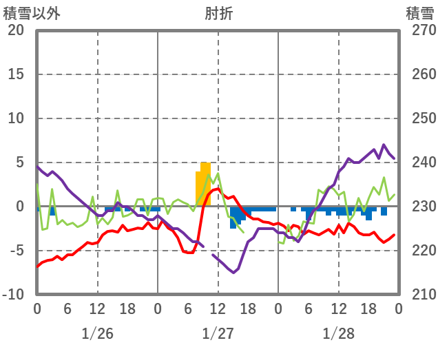 | 日 | 時 | 気温 | 降水 | 風向/風速 | 日照 | 積雪 | 降雪 |