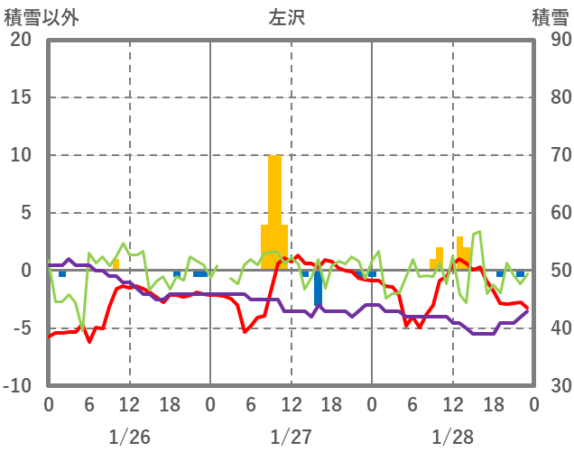 | 日 | 時 | 気温 | 降水 | 風向/風速 | 日照 | 積雪 | 降雪 |