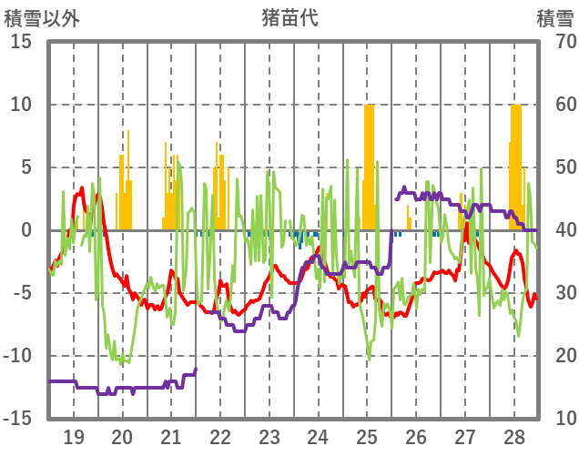 | 日 | 時 | 気温 | 降水 | 風向/風速 | 日照 | 積雪 | 降雪 |