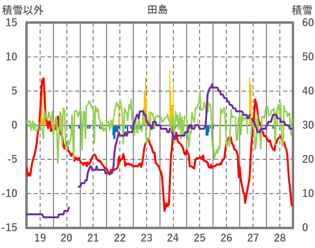 | 日 | 時 | 気温 | 降水 | 風向/風速 | 日照 | 積雪 | 降雪 |