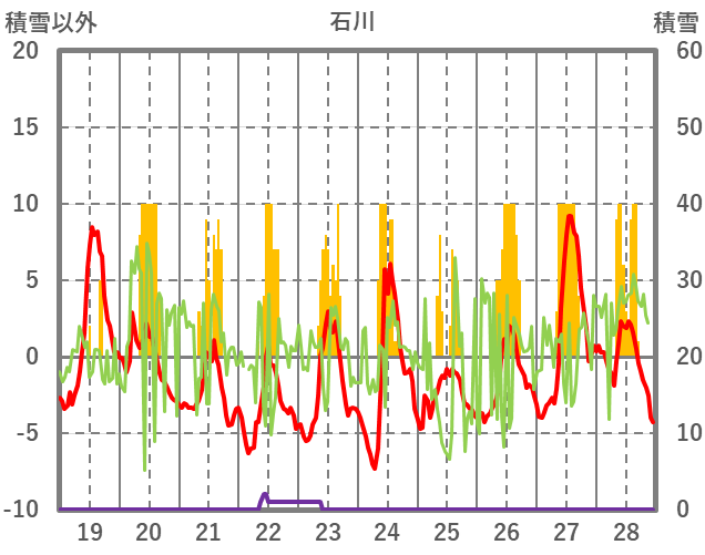 | 日 | 時 | 気温 | 降水 | 風向/風速 | 日照 | 積雪 | 降雪 |