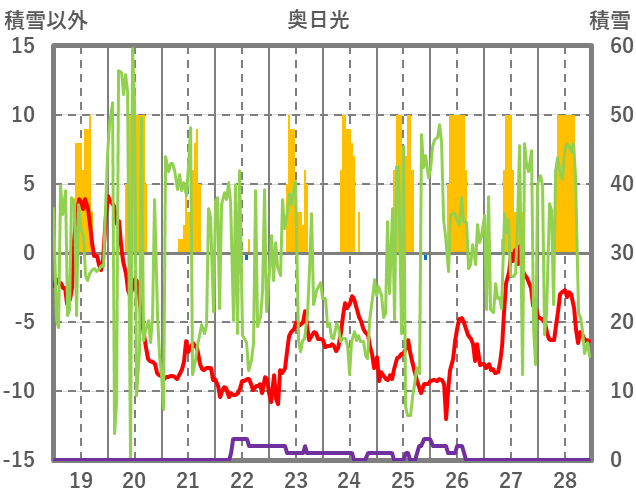 | 日 | 時 | 気温 | 降水 | 風向/風速 | 日照 | 積雪 | 降雪 |