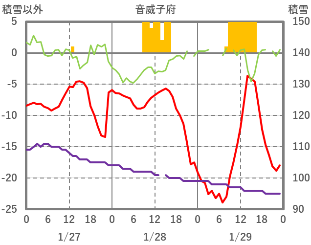 | 日 | 時 | 気温 | 降水 | 風向/風速 | 日照 | 積雪 | 降雪 |
