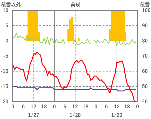 | 日 | 時 | 気温 | 降水 | 風向/風速 | 日照 | 積雪 | 降雪 |