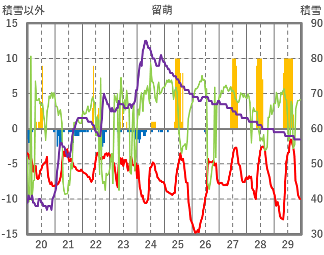 | 日 | 時 | 気温 | 降水 | 風向/風速 | 日照 | 積雪 | 降雪 |