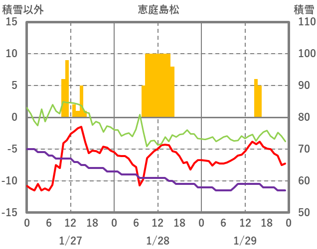 | 日 | 時 | 気温 | 降水 | 風向/風速 | 日照 | 積雪 | 降雪 |