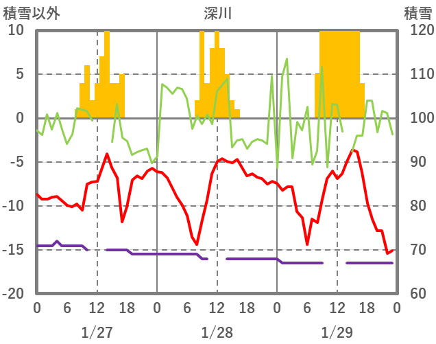| 日 | 時 | 気温 | 降水 | 風向/風速 | 日照 | 積雪 | 降雪 |