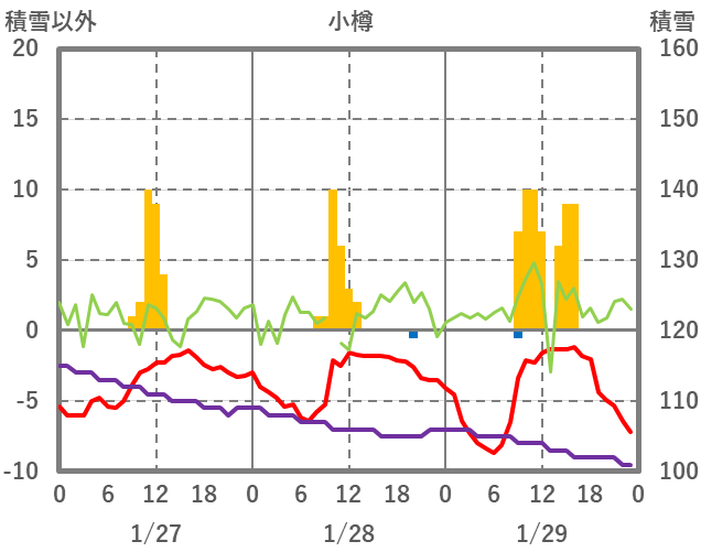 | 日 | 時 | 気温 | 降水 | 風向/風速 | 日照 | 積雪 | 降雪 |