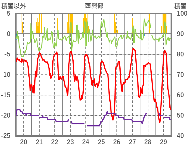 | 日 | 時 | 気温 | 降水 | 風向/風速 | 日照 | 積雪 | 降雪 |