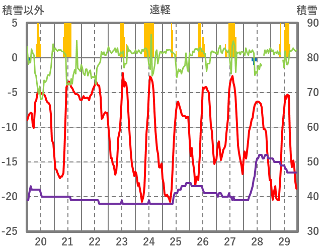 | 日 | 時 | 気温 | 降水 | 風向/風速 | 日照 | 積雪 | 降雪 |