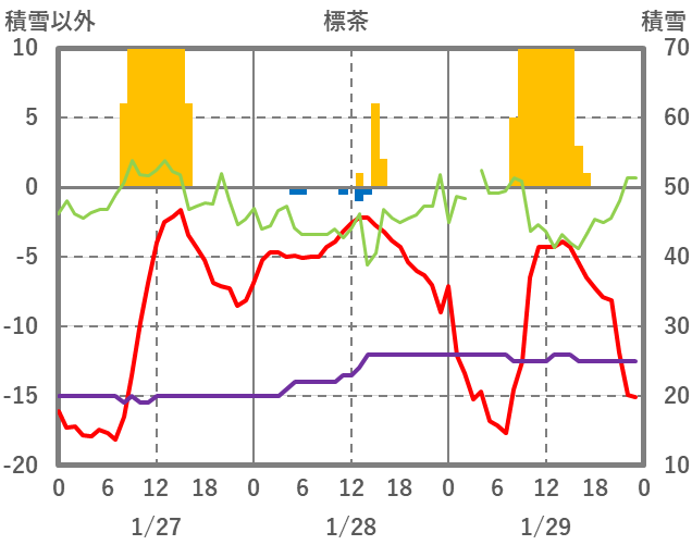 | 日 | 時 | 気温 | 降水 | 風向/風速 | 日照 | 積雪 | 降雪 |