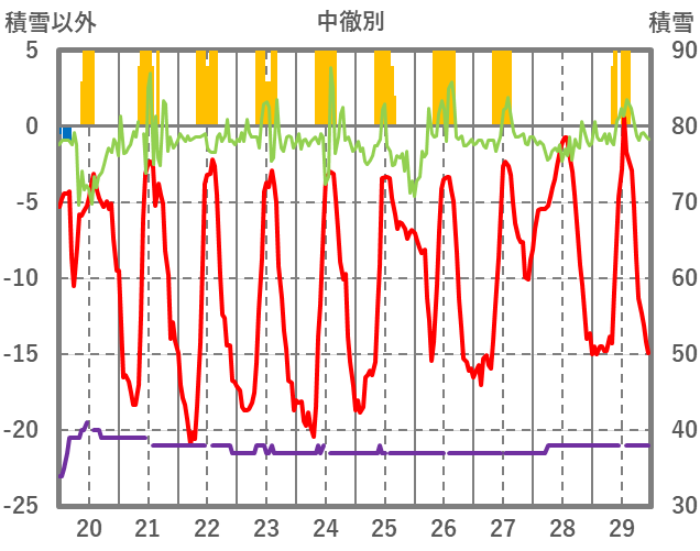 | 日 | 時 | 気温 | 降水 | 風向/風速 | 日照 | 積雪 | 降雪 |
