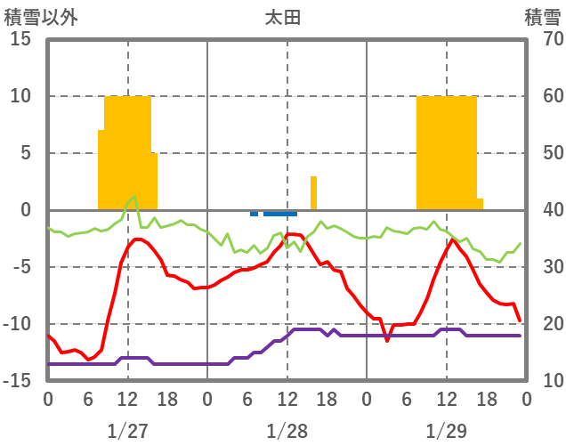 | 日 | 時 | 気温 | 降水 | 風向/風速 | 日照 | 積雪 | 降雪 |