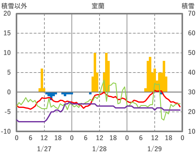 | 日 | 時 | 気温 | 降水 | 風向/風速 | 日照 | 積雪 | 降雪 |