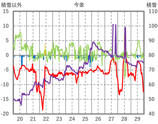 | 日 | 時 | 気温 | 降水 | 風向/風速 | 日照 | 積雪 | 降雪 |