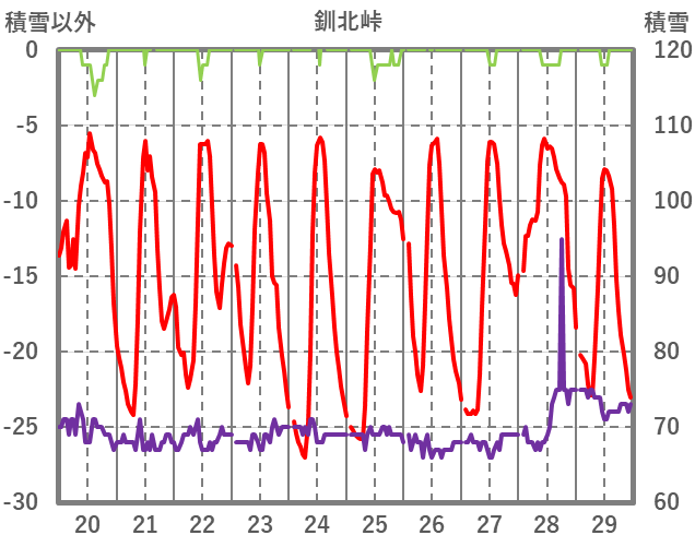 | 日 | 時 | 気温 | 降水 | 風向/風速 | 日照 | 積雪 | 降雪 |