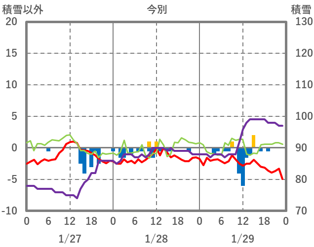 | 日 | 時 | 気温 | 降水 | 風向/風速 | 日照 | 積雪 | 降雪 |
