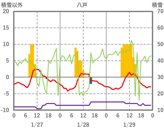| 日 | 時 | 気温 | 降水 | 風向/風速 | 日照 | 積雪 | 降雪 |