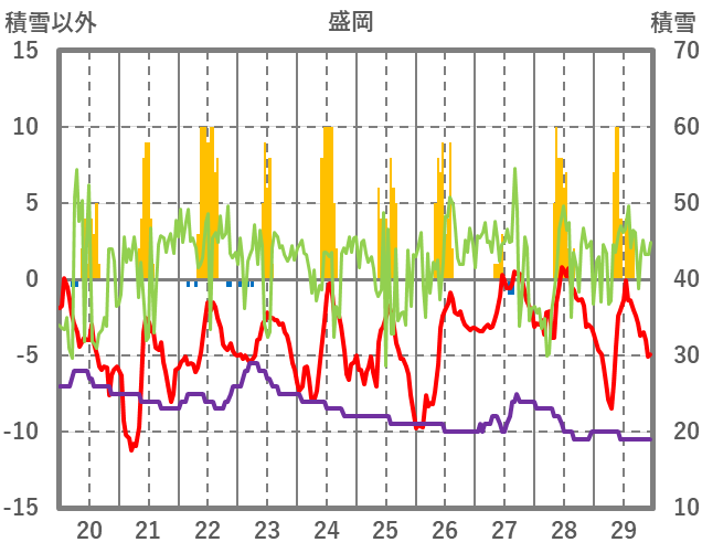 | 日 | 時 | 気温 | 降水 | 風向/風速 | 日照 | 積雪 | 降雪 |